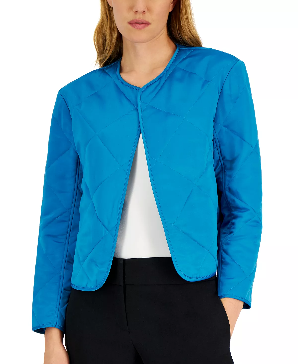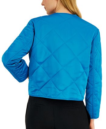 Anne Klein offers up a contemporary design in this jacket with a collarless, open front silhouette, whilst the diamond quilt lends a classic finish.