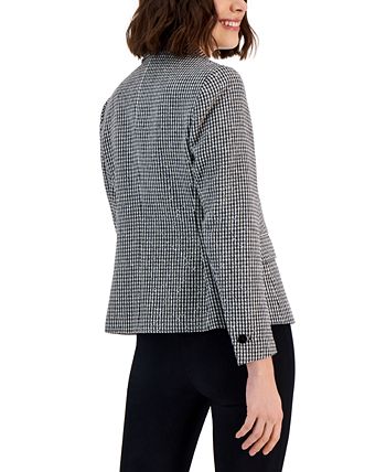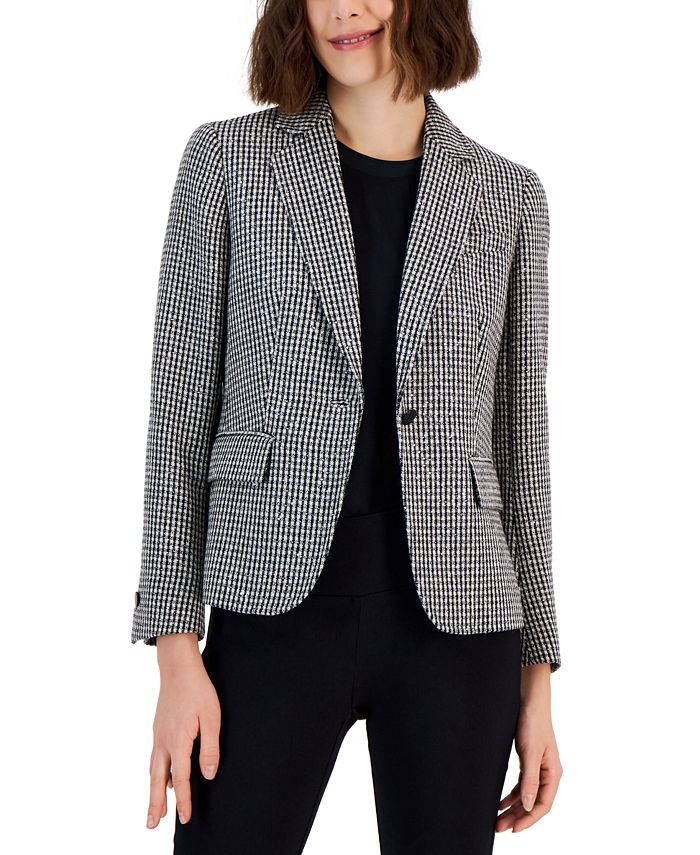 A metallic finish lends an elevated feel to Anne Klein’s tweed jacket.