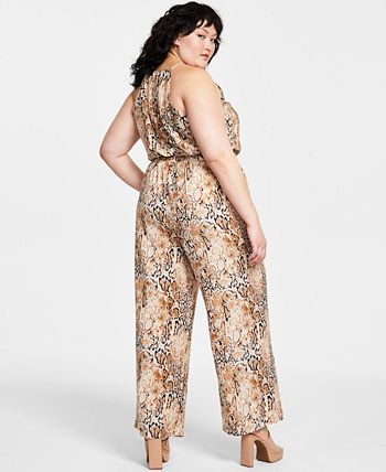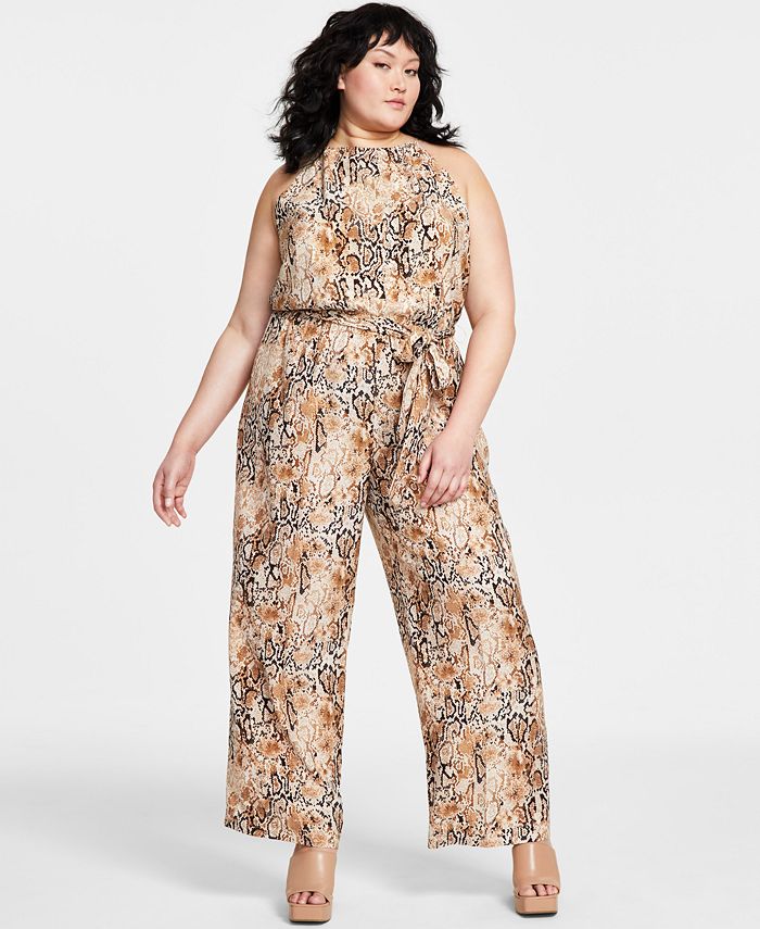 Polished and chic in a sophisticated print, this plus size Bar III jumpsuit showcases a high neckline and a tie detail at the waist.