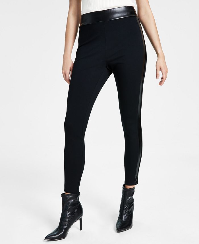 For a long, lean look, slide into these pull-on leggings from Bar III, with faux leather trim at the waist and sides.