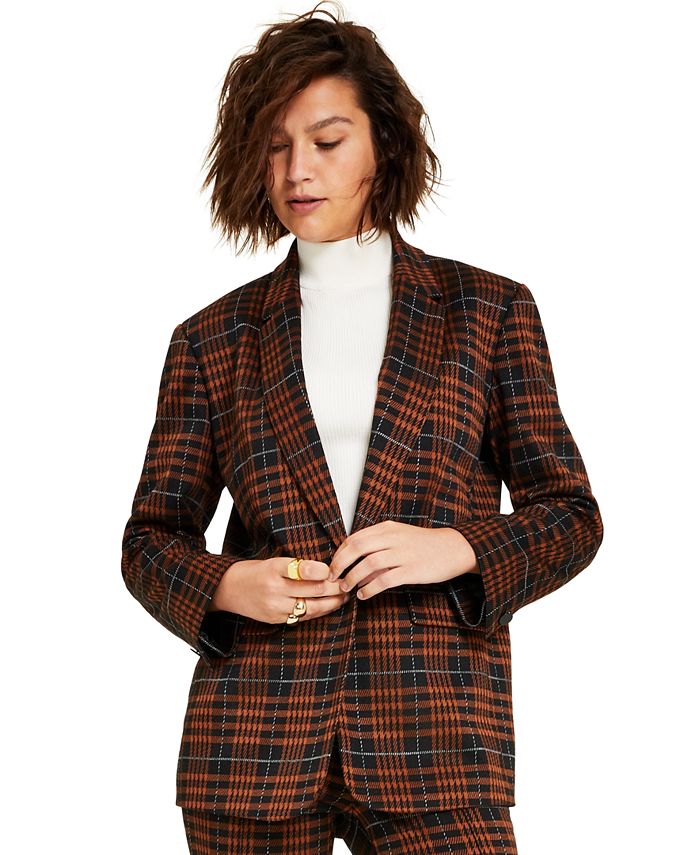 Bar III brings a timeless blazer back with this plaid style. A notch-collar and shoulder pads reinvent the silhouette.