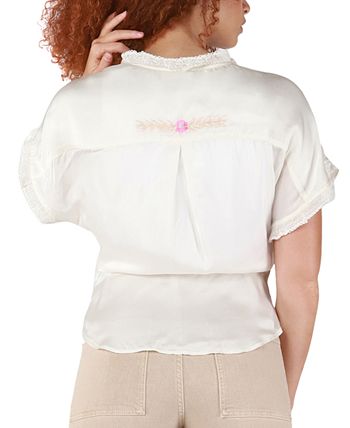- Embroidered detail at front; back yoke and pleat