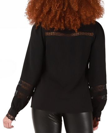 - Long sleeves with lace inserts; lace-trim cuffs