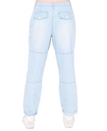 - Zipper and button closure at front; belt loops