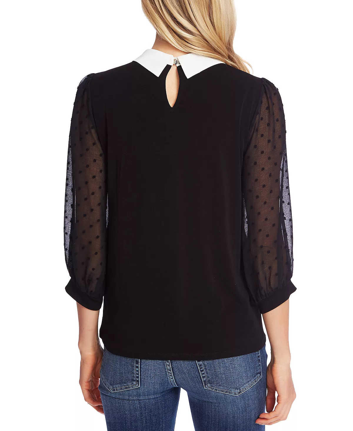 A triple treat: comfortable knit, semi-sheer clip-dot sleeves and a bright contrast collar combine in CeCe’s mixed-texture top.