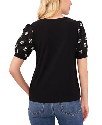 Embroidered puffs sleeves lend a charming finish to CeCe’s blouse