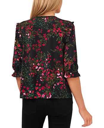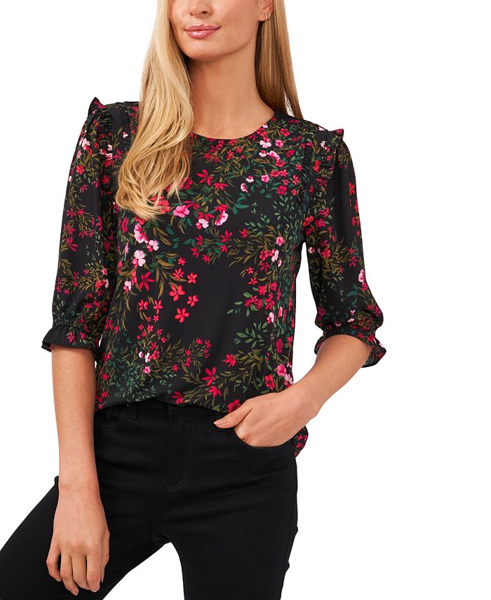 Fresh in florals and ravishing in ruffles, this 3/4-sleeve top by CeCe is an always-chic wardrobe pick.