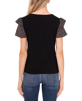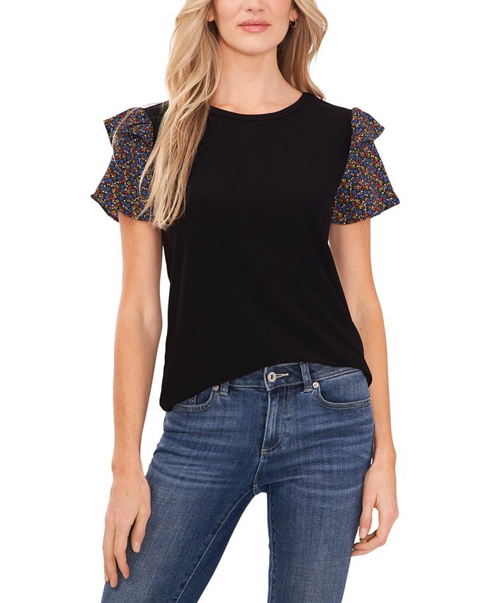 Framed with double-ruffle floral-print sleeves, this top from CeCe is timelessly chic and an easy, casualwear choice.