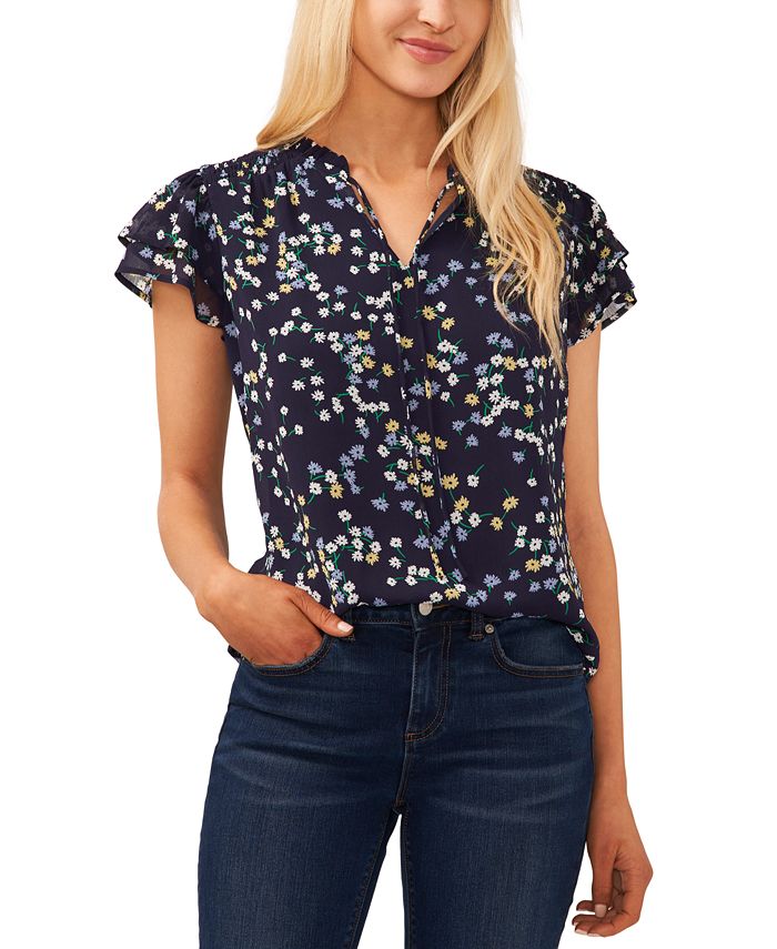 A charming scattered daisy print accents the flowy double flutter sleeves and ruffled split neck of this CeCe blouse.