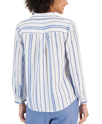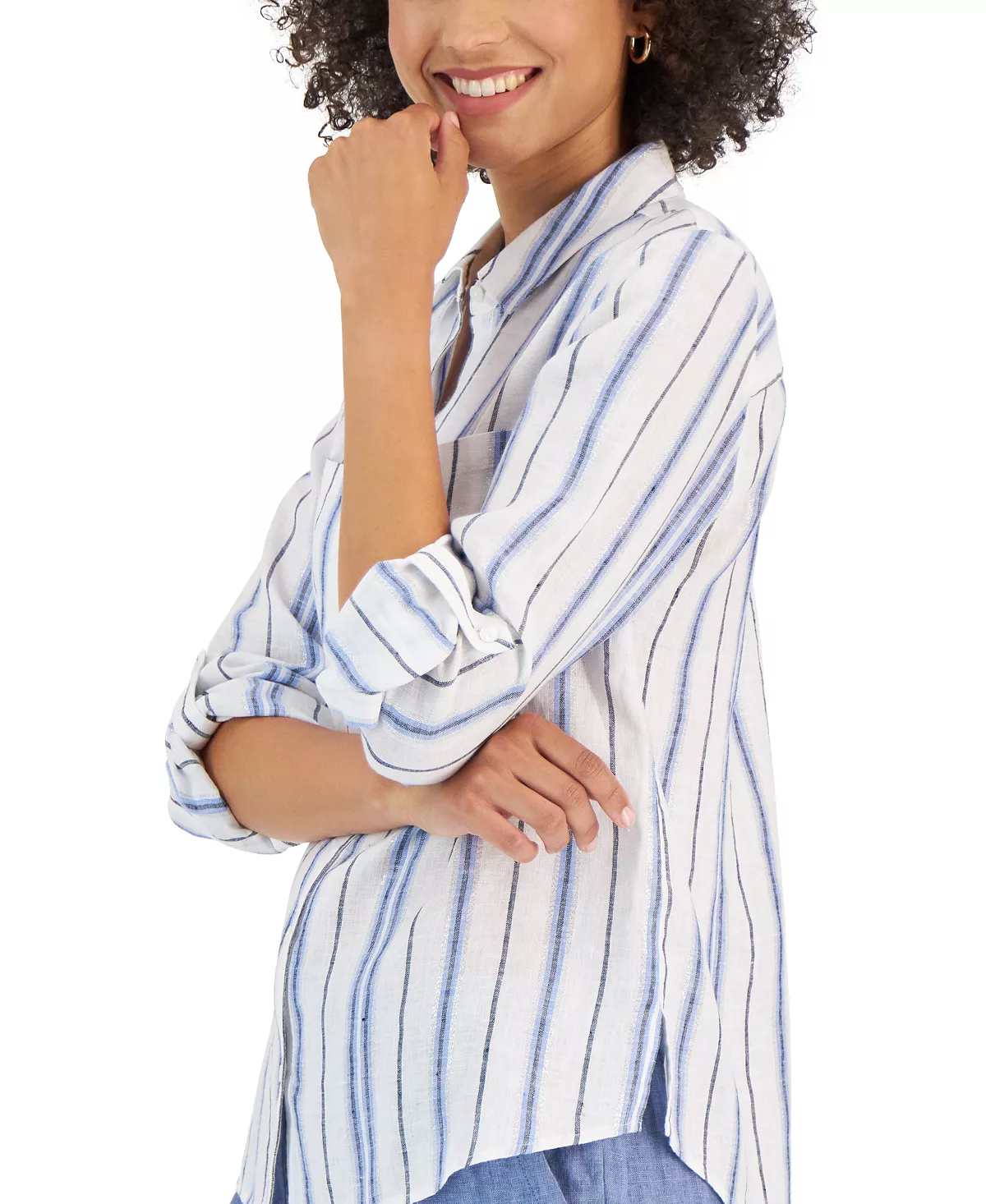 Subtle shimmer highlights contemporary stripes, updating this woven-linen shirt from Charter Club.