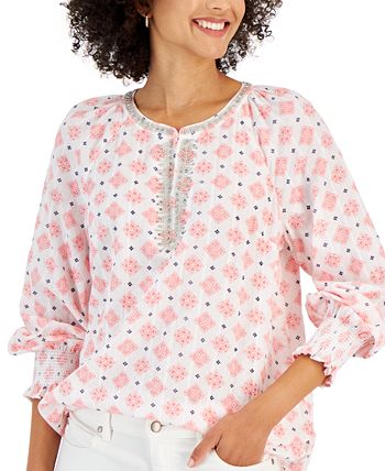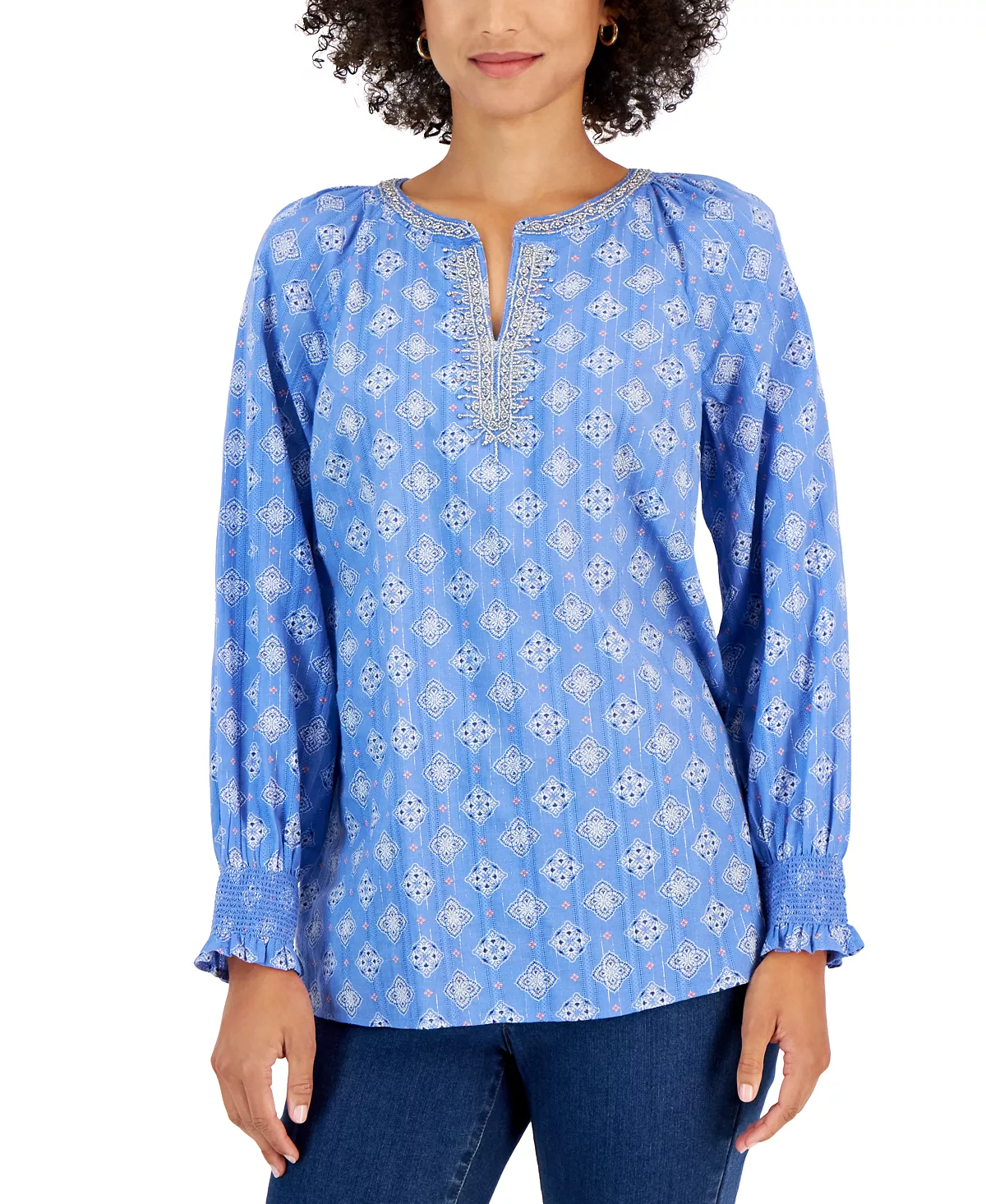 Charming shimmer. This Charter Club tunic features textured tonal stripes with metallic highlights and a vibrant medallion print.