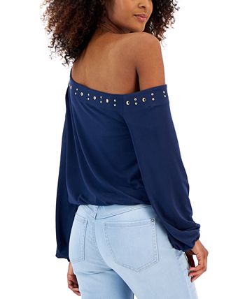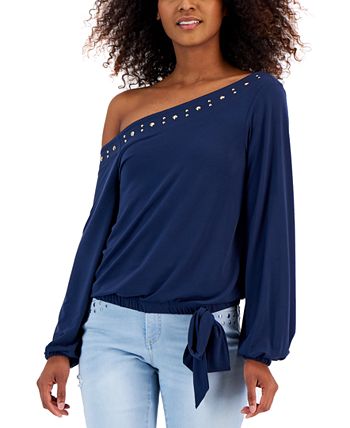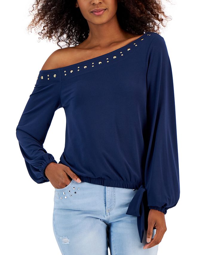 Thanks to a studded, asymmetric neckline this long sleeve top by INC International Concepts is the perfect statement topper for your favorite pair of jeans- an off-the-shoulder design elevates the sleek and stylish vibe.