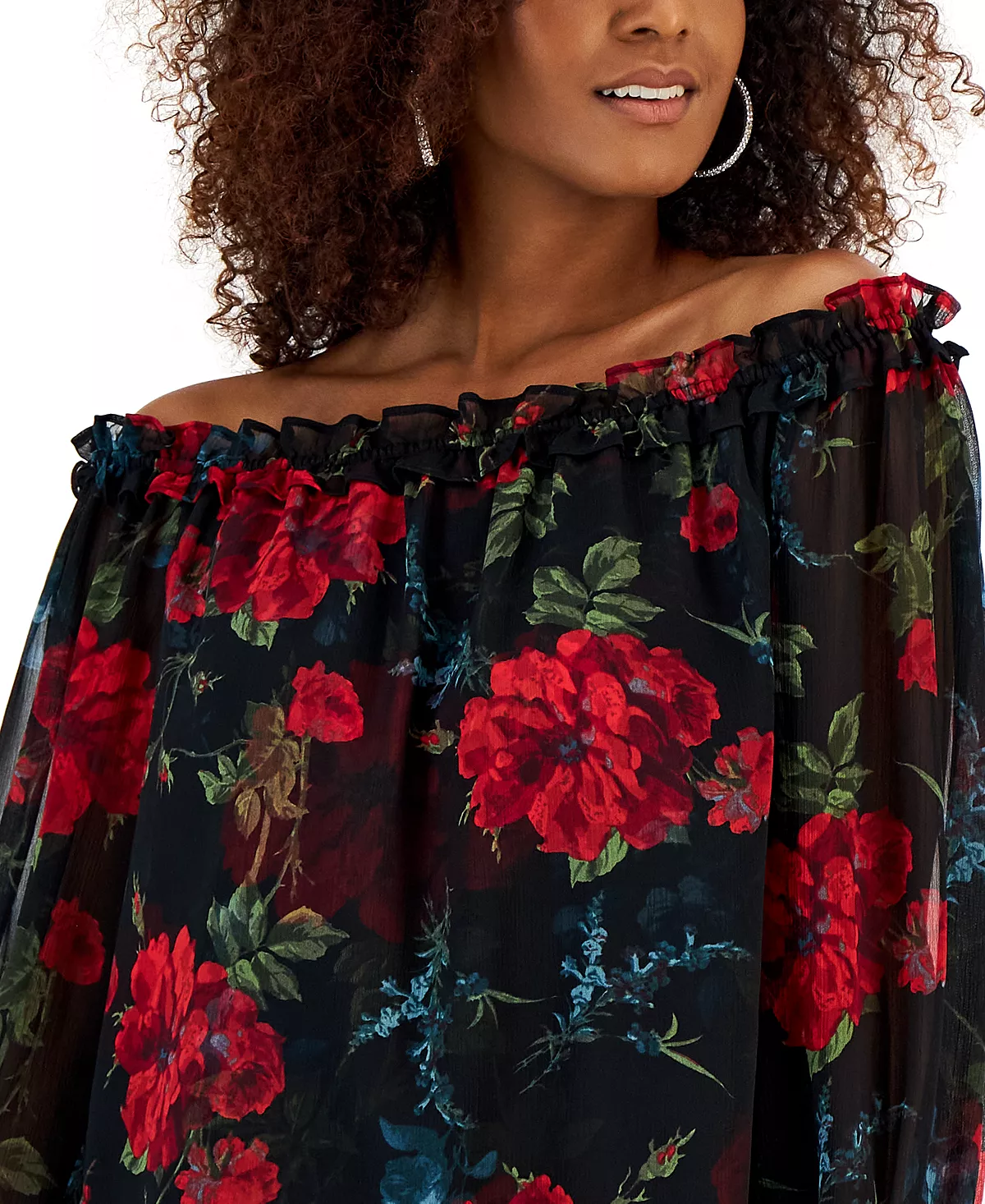 - Ruffled off-the-shoulder neckline