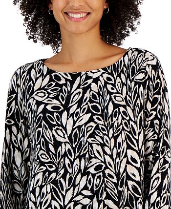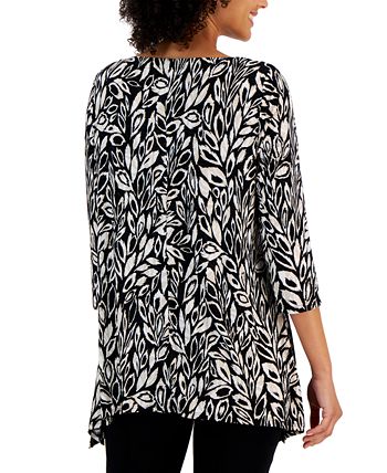 Jacquard fabric with a bold print lends texture to JM Collection’s asymmetrical-hem tunic. Wear it with leggings, jeans and more.