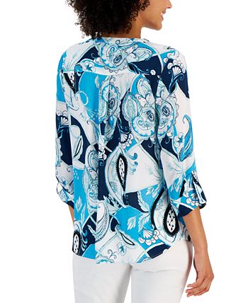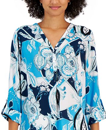 A printed tunic from JM Collection is updated with utility-inspired details roll-tab sleeves for a vibrant, contemporary look.