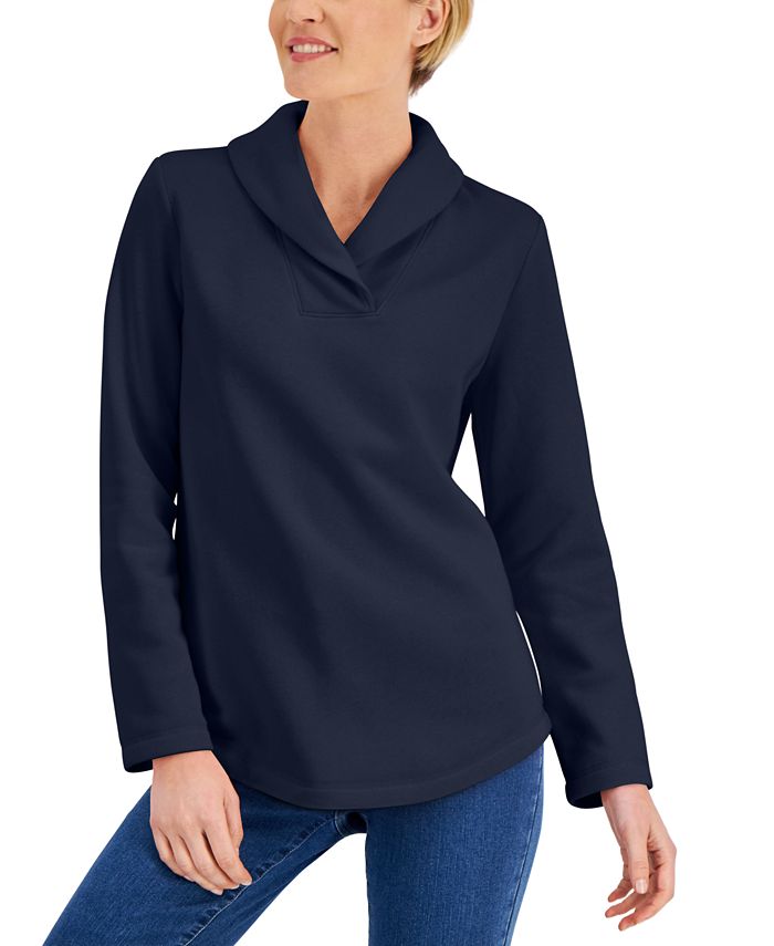 Cozy fleece gets a stylish update from Karen Scott. The relaxed top features a shawl collar for a fresh look.