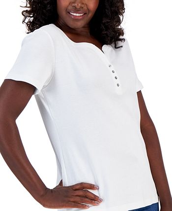 The throw on and go wardrobe essential, this Karen Scott Henley short sleeve top is super comfy and versatile for any outfit.
