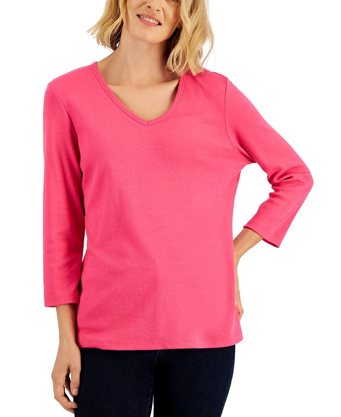 Karen Scott makes pairing easy with this solid top in a 3/4-sleeve relaxed silhouette, finished with a classic V-neck.