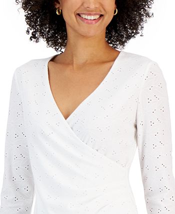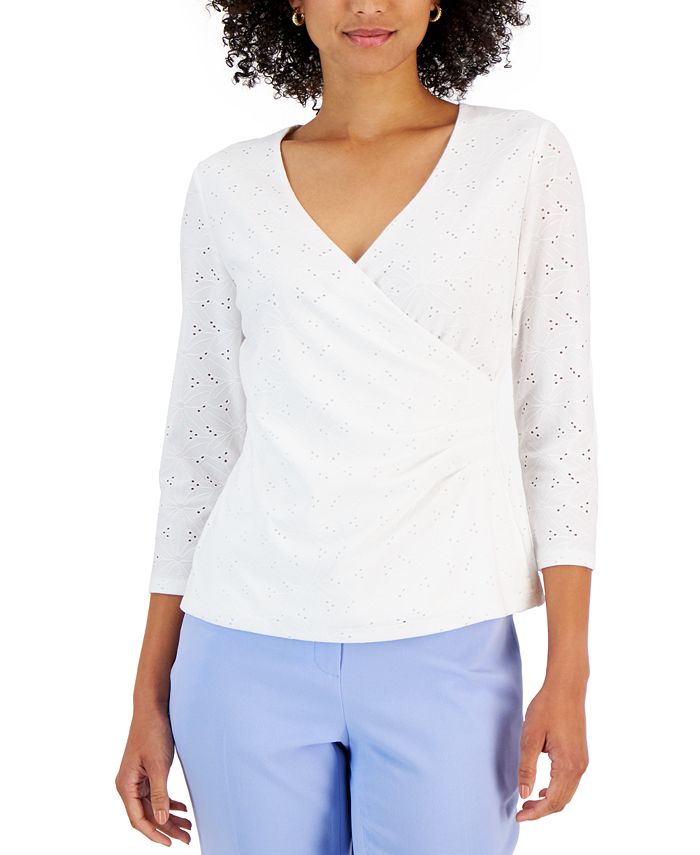 Beautifully embroidered eyelets bring endless style to this faux-wrap top from Kasper, a charming pick finished with 3/4-sleeves.