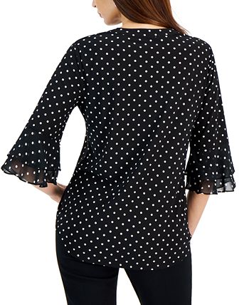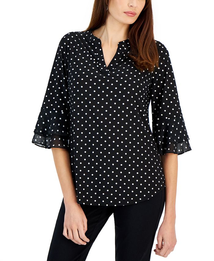 Framed by elbow-length sleeves and tiered flutter cuffs, Kasper’s split-neck top adds a polished appeal to tailored trousers or sleek pencil skirts.