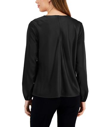 A stylish twist with a keyhole peek, this sleek Kasper blouse features a touch of stretch and a back zip. It pops from under a suit jacket and or stands out atop professional pants.