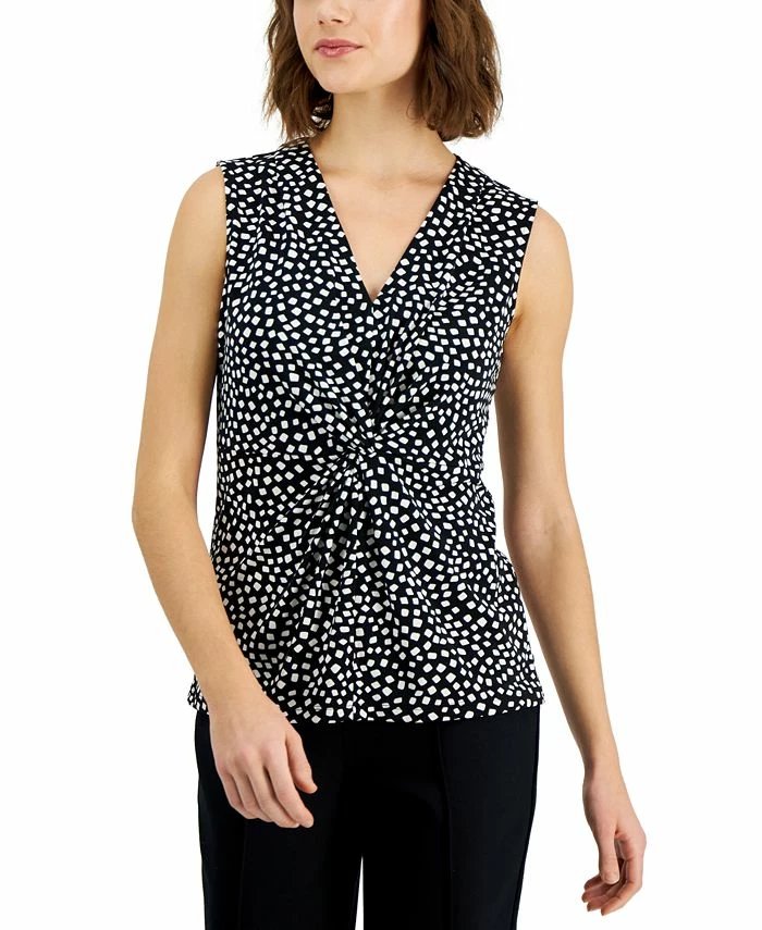 A stylish twist on a staple, this Alfani sleeveless top features a contemporary print and knot detail at the front.