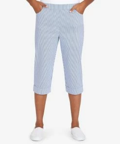 Add some variety to your bottoms collection with our stripe allure clamdigger featuring a flat-front waistband, elastic back, and side seam pockets.