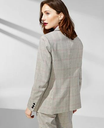 Endlessly stylish with a flattering single button closure, Anne Klein’s blazer is polished with a plaid print and piping trim at the collar.