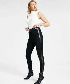 For a long, lean look, slide into these pull-on leggings from Bar III, with faux leather trim at the waist and sides.