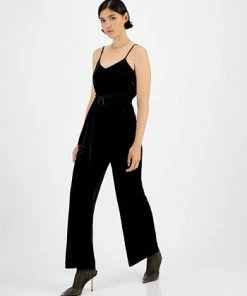 Luxe velvet brings a plush feel, a polished sheen and a touch of stretch to this V-neck belted jumpsuit from Kasper.