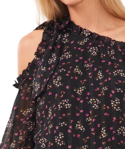 Delicate gold treads traverse this women’s top from CeCe, framed by ruffles for a charming finish.