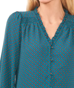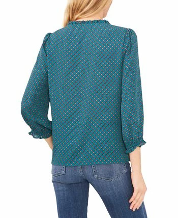 Ravishing ruffles adorn this perfectly printed chic blouse by CeCe; 3/4-sleeves frame this charming piece that can be the statement piece of your ensemble.
