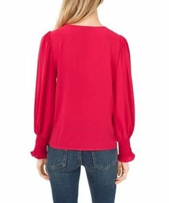 Dainty sheer sleeves with smocked cuffs frame this V-neck soft texture blouse from CeCe.