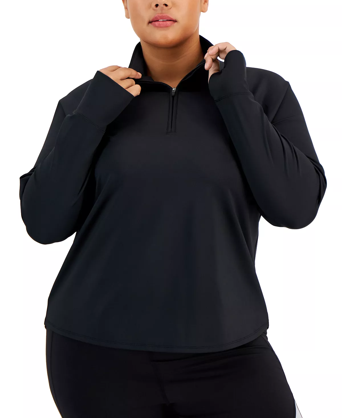 Designed with handy thumbholes and a versatile quarter-zip neckline, ID Ideology’s plus size top can be easily adjusted to be either a sleek mock neckline or polished point collar.
