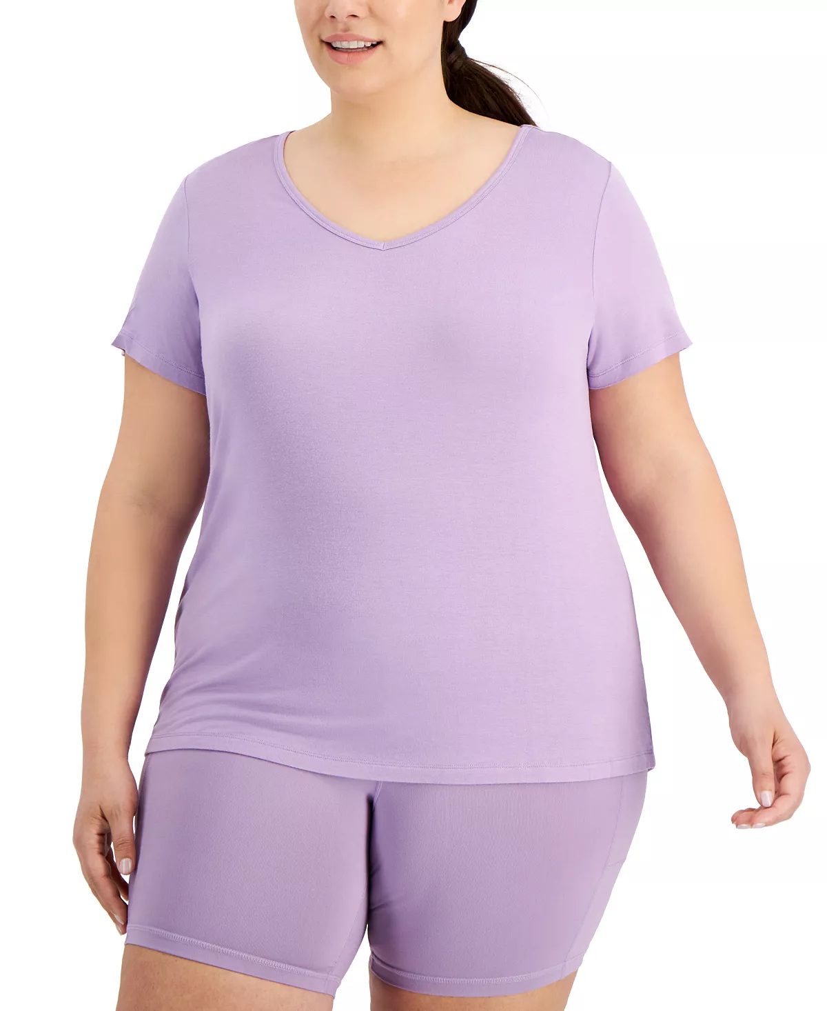 Take on athleisure in comfortable style with this V-neck T-shirt from ID Ideology. Designed to conceal and reveal your curves to flatter the plus size figure, this solid print top effortlessly pairs with bold printed leggings for a fashionably chic athletic option.