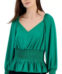 Gorgeous florals enliven stretch satin with INC International Concepts’ pretty smocked-waist blouse.