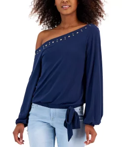 Thanks to a studded, asymmetric neckline this long sleeve top by INC International Concepts is the perfect statement topper for your favorite pair of jeans- an off-the-shoulder design elevates the sleek and stylish vibe.