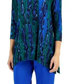A gorgeous snake-inspired print covers every inch of this 3/4-sleeve top from JM Collection. A handkerchief hem completes the look.