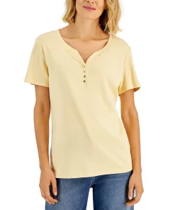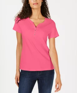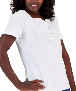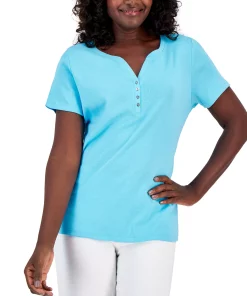 The throw on and go wardrobe essential, this Karen Scott Henley short sleeve top is super comfy and versatile for any outfit.