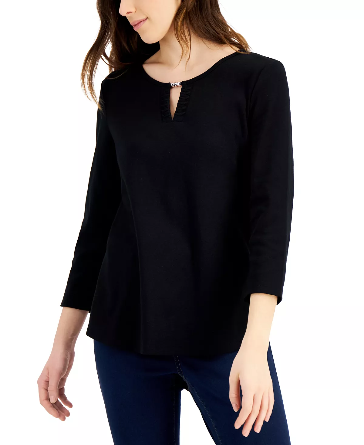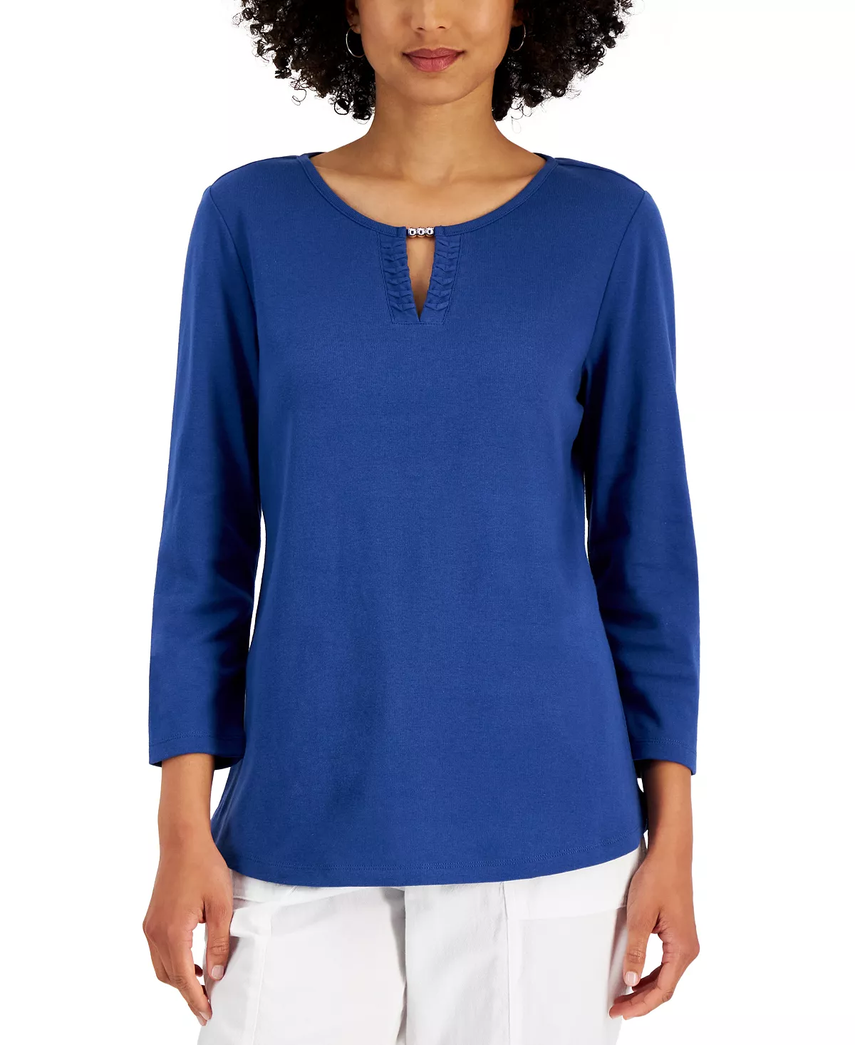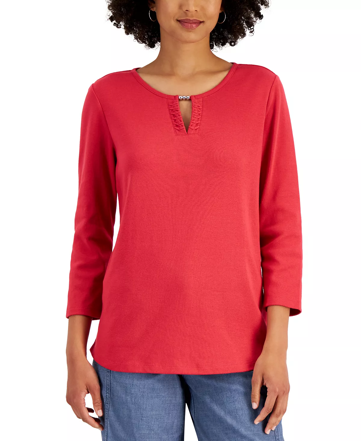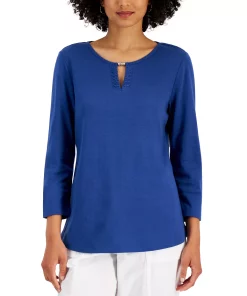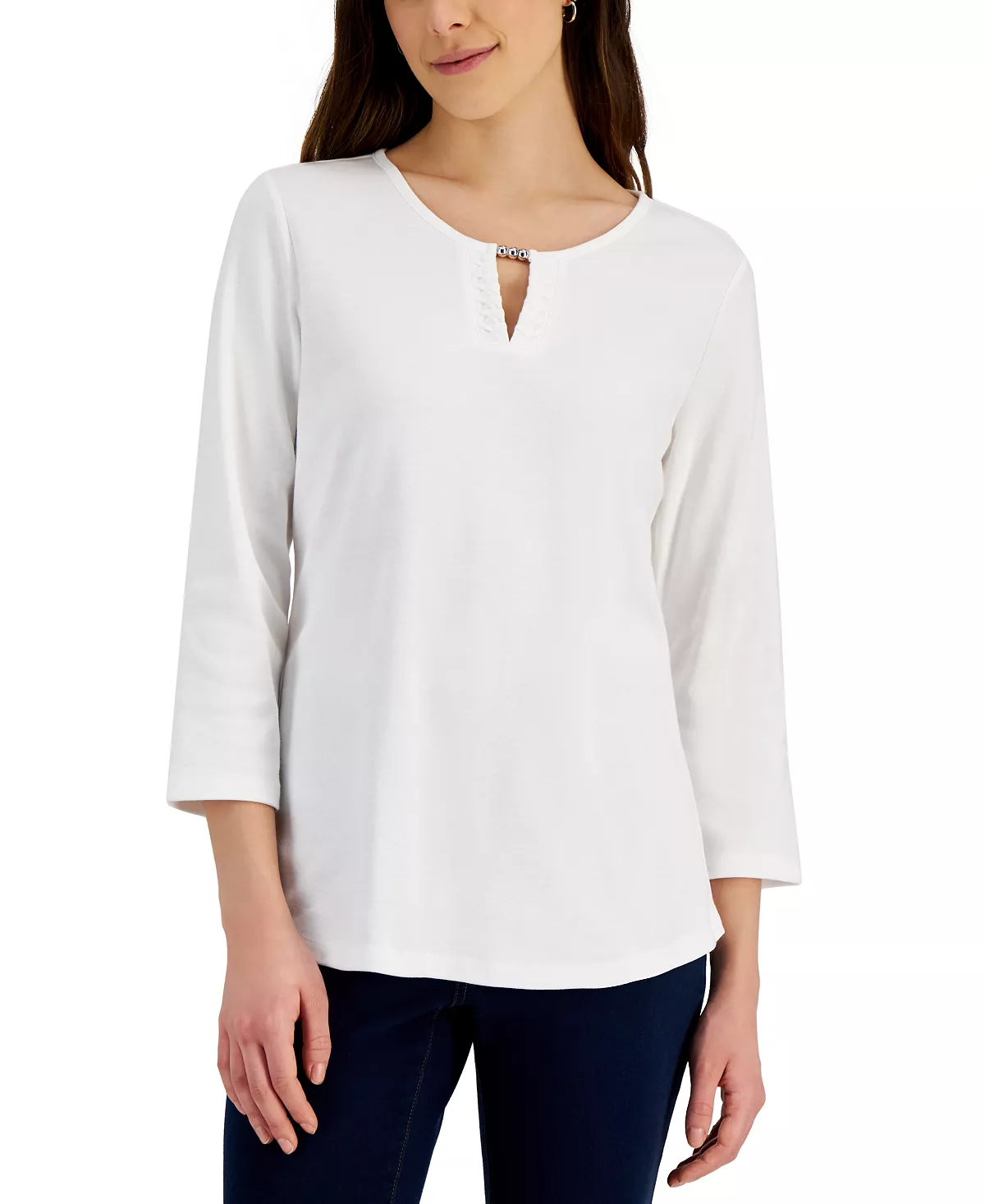 Skip the T-shirt and go for the polished look of this Karen Scott top, in all cotton with beads at the split neckline.