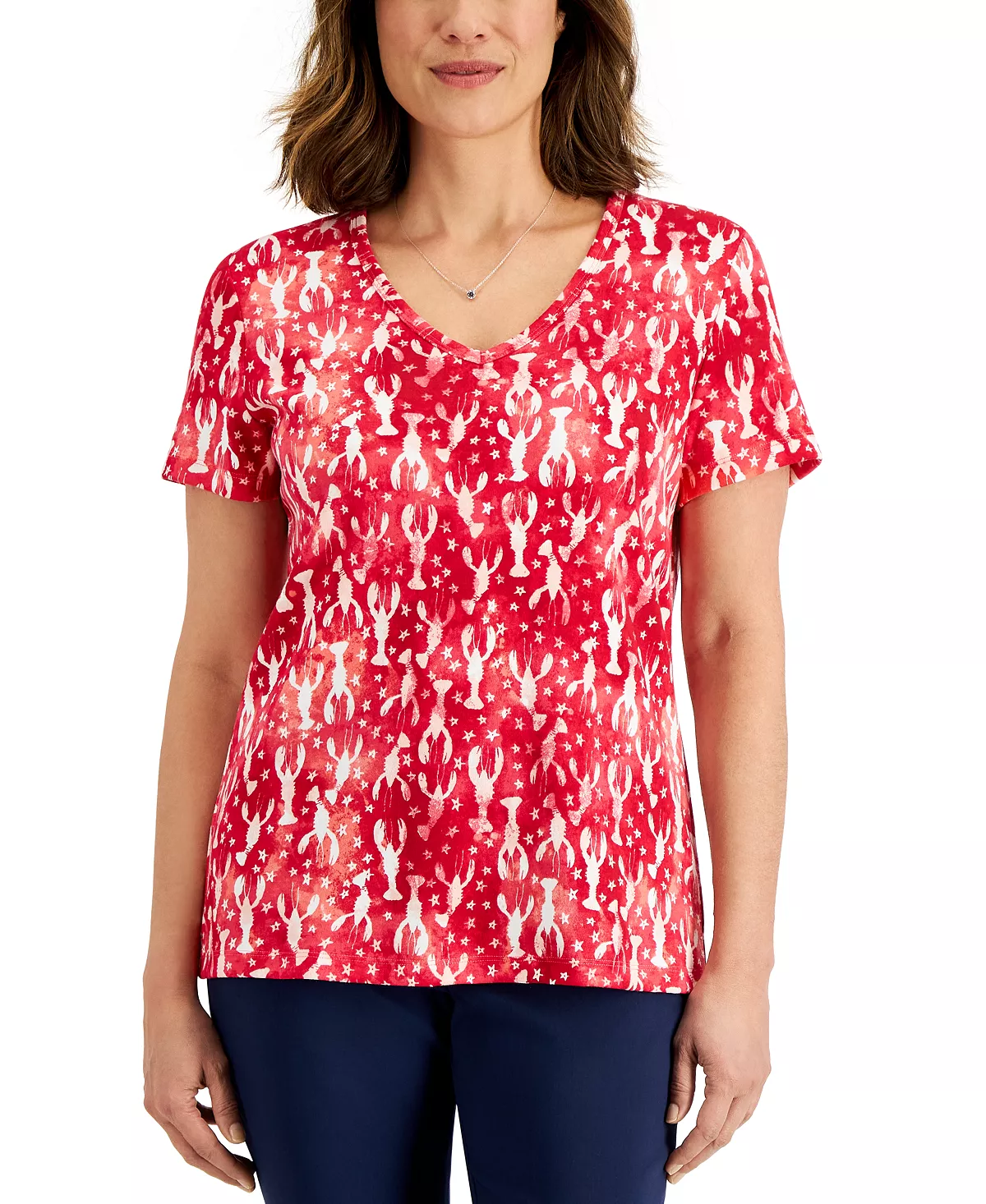 Add ocean-fresh style to your collection with this Karen Scott top, a relaxed look in a fun lobster print.