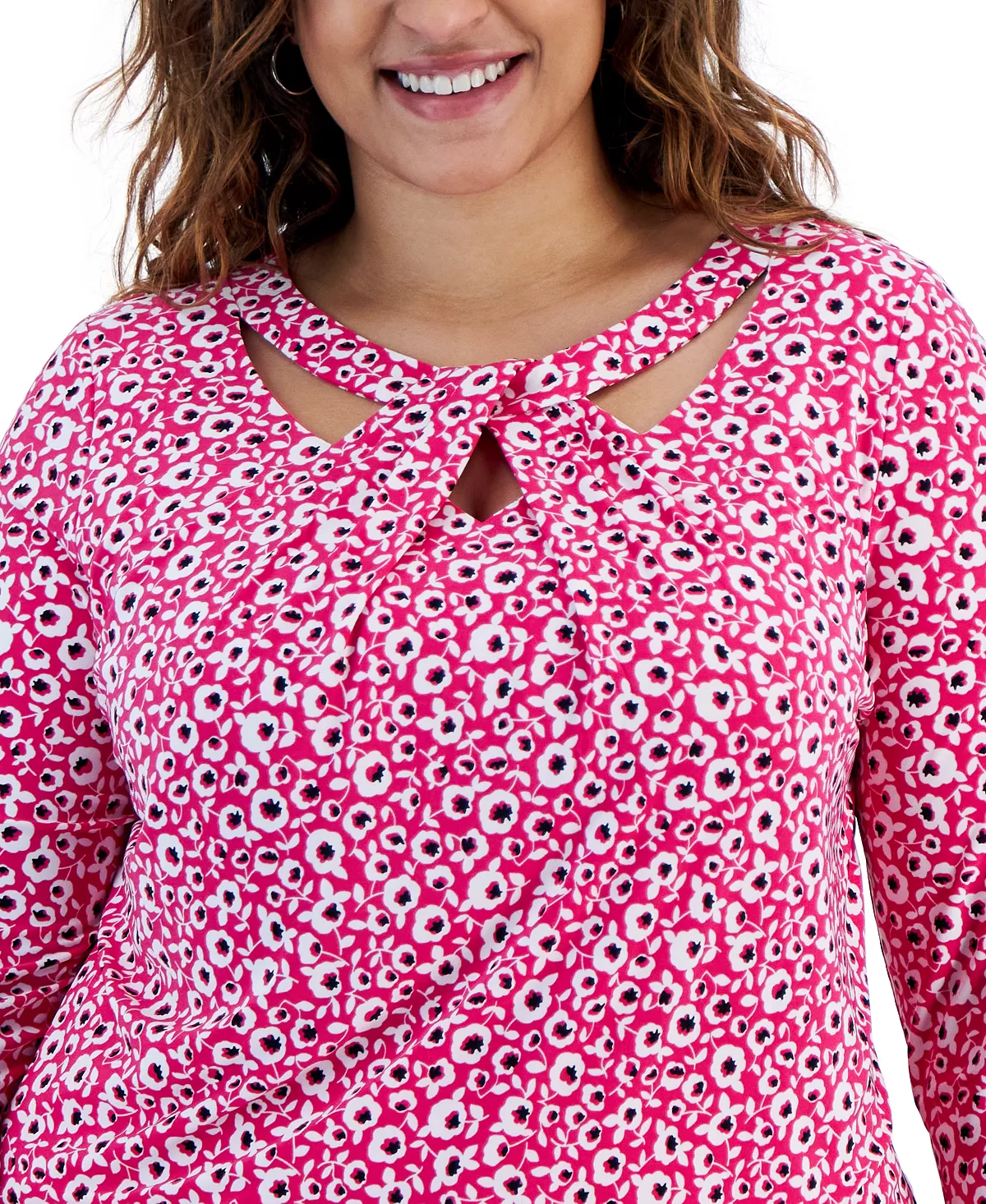 Kasper pairs cut-out details with a bright floral print in this chic plus 3/4-sleeve size top.