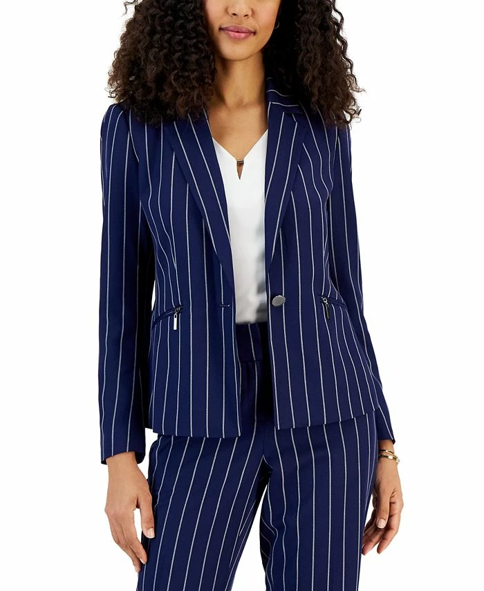 Zip pockets lend a modern edge to this pinstriped blazer from Kasper.