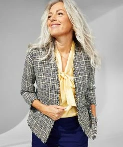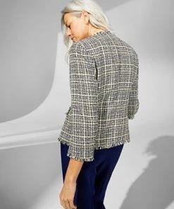 The perfect finisher for your work look, this tweed open front blazer boasts chic detail with a fringe trim throughout.