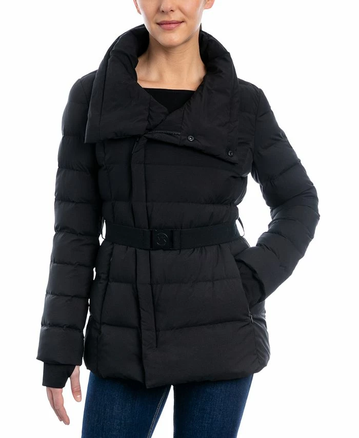 An asymmetric zip front lends a chic vibe to this belted down puffer coat from MICHAEL Michael Kors.