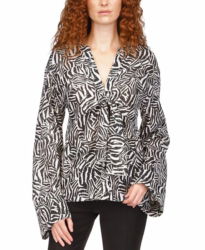 An oversized tie and flowy sleeves stylishly contrast a shimmery zebra print, bringing a fresh look with this MICHAEL Michael Kors top.