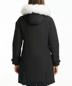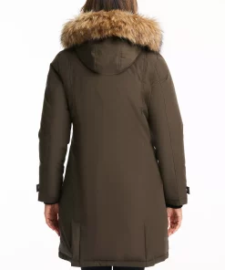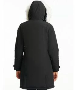 - Attached drawstring hood with removable faux-fur trim; front zipper closure with button overlay
