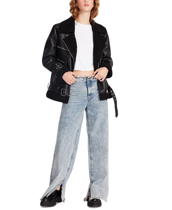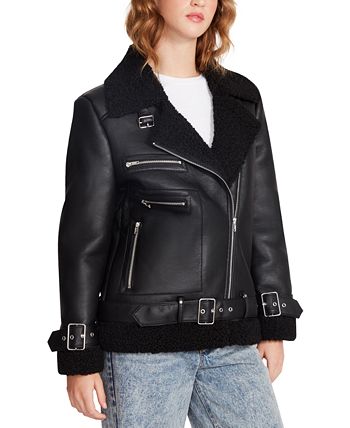 Steve Madden softens a tough girl look in this faux leather moto jacket with sherpa trim and lining.