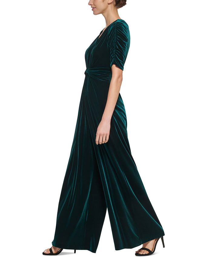 Go from desk to dinner in glam style with this gorgeous Vince Camuto velvet jumpsuit featuring a twist-front detail and a flowing flare-leg silhouette.