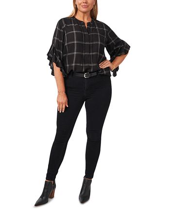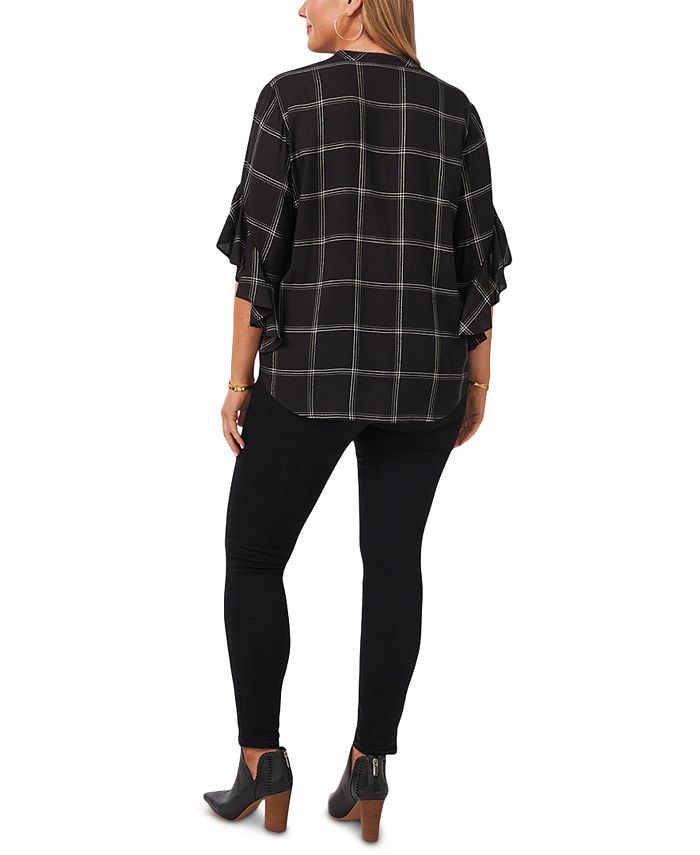 Covered in a wear-with-anything print, this Vince Camuto plus size top features sleek pleats at the front and flutter sleeves for style that’s soft and charming